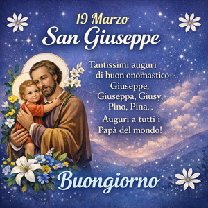 CardImmagini San Giuseppe Buongiorno e Buon OnomasticoImmagini divertenti e frasi da ridere da mandare su Whatsapp, condividere su Instagram o su Facebook per celebrare il 19 Marzo, la Festa del Papà.Andrea Bosetti • 18 Marzo 2026, 18:22 Guarda le VideoricetteSeguici su YouTube Anelli di Zucchine Seguici su YouTube! Anelli di Zucchine Il 19 marzo è una data speciale nel calendario italiano, perché si celebra San Giuseppe, figura amatissima della tradizione cristiana e simbolo di umiltà, forza e protezione della famiglia. In questa giornata, oltre al valore religioso e culturale della ricorrenza, si rivolge un pensiero affettuoso a tutti coloro che portano il nome Giuseppe, con un semplice ma sentito messaggio: buongiorno e buon onomastico. È l’occasione ideale per dedicare una frase gentile, condividere un’immagine augurale o inviare un pensiero speciale a parenti, amici e persone care.San Giuseppe è celebrato in Italia il 19 marzo come sposo della Vergine Maria, padre putativo di Gesù, protettore dei papà e dei lavoratori (falegnami, carpentieri). È una figura centrale della fede, proclamato patrono della Chiesa universale da Papa Pio IX nel 1870, simbolo di dedizione e lavoro.Giuseppe significa “Dio accresca”, simbolo di fiducia nella provvidenza. La ricorrenza è legata a dolci tipici, come le zeppole di San Giuseppe, preparate specialmente nel Sud Italia. È considerato custode della Chiesa universale, patrono della “buona morte” e protettore delle famiglie.La figura di San Giuseppe incarna valori di laboriosità, obbedienza e umiltà, rendendolo una delle figure più care e venerate nella tradizione cattolica italiana.Immagini Buon San Giuseppe gratis da mandare Copia Immagine Copia Immagine Copia Immagine Copia ImmagineFrasi per la Festa del PapàBuon onomastico Giuseppe! Che questa giornata ti porti felicità, salute e tanto affetto.Oggi si festeggia un nome importante: auguri di cuore per San Giuseppe!Con affetto e stima, ti auguro un felice San Giuseppe e uno splendido onomastico.Buon San Giuseppe! Un abbraccio e tanti auguri sinceri.