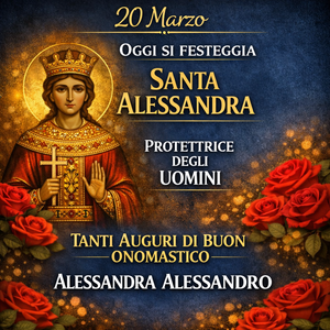 CardImmagini Santa Alessandra Buongiorno e Auguri Buon OnomasticoImmagini da mandare su Whatsapp, condividere su Instagram o su Facebook per celebrare il 20 Marzo, onomastico di Santa AlessandraGiorgio Loda • 19 Marzo 2026, 20:24 Guarda le VideoricetteSeguici su YouTube Anelli di Zucchine Seguici su YouTube! Anelli di Zucchine Il 20 marzo è una data speciale per chi porta il nome Alessandra, perché si ricorda Santa Alessandra, figura venerata nella tradizione cristiana. In questa giornata, oltre al significato religioso della ricorrenza, si rivolge un pensiero affettuoso a tutte le Alessandra con un messaggio semplice ma sentito: buongiorno e buon onomastico. È un’occasione perfetta per dedicare una frase gentile, condividere un’immagine augurale o inviare un pensiero speciale ad amiche, parenti e persone care.Il nome Alessandra è legato alla figura di sant’Alessandra martire, il cui onomastico viene comunemente celebrato il 20 marzo. Il nome, di origine greca, richiama il significato di “protettrice degli uomini” o “colei che difende”, e porta con sé un’idea di forza, sensibilità e nobiltà d’animo.Alessandra è un nome elegante e senza tempo, molto amato in Italia, e il giorno dell’onomastico rappresenta una bella occasione per far sentire speciale chi lo porta. Un augurio affettuoso, una frase piena di dolcezza o un piccolo gesto possono rendere questa ricorrenza ancora più significativa.La figura di Santa Alessandra richiama valori di coraggio, fede e determinazione, qualità che rendono questo nome particolarmente intenso e ricco di significato. Per questo il suo onomastico non è solo una ricorrenza del calendario, ma anche un momento per celebrare una persona cara con affetto e attenzione.Immagini Auguri Santa Alessandra gratis da mandare Copia Immagine Copia Immagine Copia Immagine Copia Immagine
