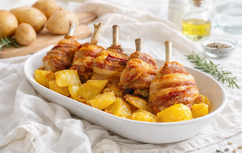 Secondi PiattiCosce di Pollo con Pancetta al FornoScopri le cosce di pollo con pancetta al forno: carne succosa avvolta in pancetta croccante, aromi di senape e rosmarino. Una ricetta semplice e irresistibile!Ricetta di Giorgio Loda • 12 Febbraio 2026Club delle Ricette è anche su WhatsApp. Non perderti le ricette più nuove e ogni giorno i menu migliori e le idee per cucinare. Iscriviti al Canale Difficoltà MediaPreparazione 10 minutiCottura 1 oraDosi per 3 persone Guarda le VideoricetteSeguici su YouTube Anelli di Zucchine Seguici su YouTube! Anelli di Zucchine Invia × Facebook Twitter Email Pinterest Salva StampaCosce di Pollo con Pancetta Croccante al Forno, Saporite e FaciliImmaginate di togliere dal forno una teglia fumante, da cui si sprigiona un profumo avvolgente di erbe aromatiche e pancetta croccante: sono le cosce di pollo con pancetta al forno, un piatto ricco di gusto e tradizione perfetto come idea per pranzo con cosce di pollo o per una cena in compagnia. La ricetta delle cosce di pollo al forno è la soluzione ideale per chi desidera un secondo di carne al forno facile ma capace di conquistare ogni palato, anche quello dei più esigenti. Preparare il pollo al forno croccante con pancetta significa racchiudere la carne tenera del pollo in un abbraccio succoso e saporito, grazie alle fette di pancetta che durante la cottura rilasciano aromi irresistibili e mantengono le cosce incredibilmente umide.Un tocco in più viene dalla senape, che dona una nota leggermente piccante e raffinata, mentre le patate, adagiate sotto il pollo, assorbono i succi della carne e il profumo avvolgente del rosmarino, diventando un contorno dorato e saporitissimo. Siete alla ricerca di una ricetta veloce con cosce di pollo, che richieda pochi minuti di preparazione ma vi lasci tempo libero mentre il forno lavora per voi? Questa è la scelta giusta, perché basta condire e infornare, senza complicazioni né passaggi elaborati.Inoltre, il pollo arrosto con pancetta e aromi è perfetto per riscaldare le serate più fredde, regalando un comfort food che mette d’accordo tutta la famiglia. Se volete provare altre varianti sfiziose di pollo al forno, vi suggeriamo di scoprire anche le Ali di Pollo al Forno o il delizioso Pollo con Zucca e Patate al Forno. Oppure, sperimentate nuovi sapori con il Pollo al Forno con Salsa di Albicocche, le Polpette di Pollo Light al Forno e gli Involtini di Pollo Crocchè. Preparare la ricetta della pancetta al forno con pollo diventerà il vostro segreto per portare in tavola un piatto di pollo per la cena sempre sfizioso e perfettamente bilanciato tra croccantezza e morbidezza. Non vi resta che provare questa ricetta e lasciarvi conquistare!Ingredienti per 3 persone3 Fusi di Pollo circa 800 g200 g di Pancetta affettata sottile20 g di Senapeq.b. di SalePer le patate:500 g di Patate1 rametto di Rosmarinoq.b. di Saleq.b. di Pepe10 g di Senapeq.b. di Olio Extravergine d'OlivaCopia Lista IngredientiApri in AppProcedimentoScarica la nostra APP Con meno pubblicità, puoi creare i tuoi ricettari e ricevere nuove ricette ogni giorno. Scarica APP Per preparare le cosce di pollo con pancetta al forno, iniziate pulendo le cosce rimuovendo la pelle e la parte terminale dell’osso con la cartilagine, in modo da ottenere una superficie uniforme.Spennellate generosamente ogni coscia di pollo con la senape, assicurandovi di coprire tutta la superficie della carne per garantire il massimo sapore.Avvolgete ciascuna coscia con una fetta di pancetta tagliata molto sottile, facendola aderire bene alla carne e assicurandovi che sia completamente coperta.Pelate le patate e tagliatele a pezzi di medie dimensioni, poi mettetele in una teglia da forno insieme al sale, un cucchiaino di senape, un pizzico di pepe, il rametto di rosmarino e un filo di olio di oliva extravergine, mescolando bene affinché il condimento si distribuisca uniformemente.Adagiate le cosce di pollo avvolte nella pancetta sopra le patate, conditele con un pizzico di sale e infornate a 180 gradi in modalità statica per 50 minuti, quindi passate alla modalità ventilata per altri 10 minuti per rendere la pancetta perfettamente croccante e dorata. Ricordate infine di scaricare la nostra App con contenuti esclusivi e meno pubblicità!Varianti e AlternativePer una versione ancora più aromatica, potete aggiungere all’impasto della senape un cucchiaino di miele e un pizzico di paprika dolce o piccante. Se preferite un sapore più mediterraneo, sostituite il rosmarino con timo fresco e aggiungete degli spicchi d’aglio interi nella teglia insieme alle patate. Per una variante più leggera, potete utilizzare fettine di pancetta affumicata magra o sostituirla con il prosciutto crudo, che renderà il piatto meno grasso ma ugualmente saporito. Chi ama i sapori intensi può marinare le cosce di pollo per 2-3 ore prima della cottura in una miscela di senape, vino Marsala e erbe aromatiche.ConsigliSe durante la cottura notate che la carne e le patate tendono ad asciugarsi troppo, potete bagnarle con un po’ di vino bianco per mantenere il giusto grado di umidità. Per una doratura ancora più uniforme della pancetta, potete attivare il grill del forno negli ultimi 1-2 minuti di cottura, controllando costantemente per evitare che si bruci. Servite le cosce di pollo ben calde, accompagnate dalle patate croccanti e aromatiche, ideali per raccogliere tutti i succhi di cottura.ConservazionePotete conservare le cosce di pollo con pancetta al forno in frigorifero all’interno di un contenitore ermetico per alimenti per un massimo di 2 giorni. Al momento di consumarle, riscaldatele in forno a 160 gradi per circa 10-15 minuti oppure in padella a fuoco basso con un cucchiaio di brodo o acqua e il coperchio, fino a quando saranno ben calde.Commenti ★ ★ ★ ★ ★ × 4 / 5 You need to enable JavaScript to vote Annulla risposta Lascia un commento