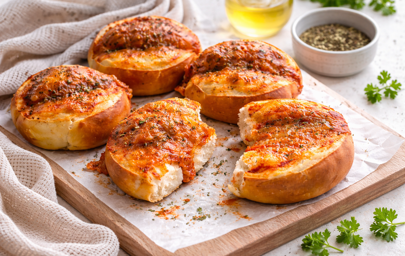 Scopri il Laugenbrot alla pizzaiola, il pane dal cuore morbido e crosta croccante arricchito con mozzarella, salsa di pomodoro e un tocco di origano irresistibile