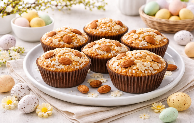 Lievitati DolciMuffin ColombaMuffin Colomba: la ricetta facile e veloce per preparare muffin pasquali soffici con aroma di mandorla, frutta candita, scorza d'arancia e limone, decorati con granella di zucchero e mandorle. Pronti in 30 minuti!Ricetta di Andrea Bosetti • 1 Aprile 2026Difficoltà MediaPreparazione 5 minutiCottura 25 minutiDosi per 18 muffin Invia × Facebook Twitter Email Pinterest Salva StampaI Muffin Colomba sono una di quelle ricette che amo preparare nel periodo pasquale perché riescono a racchiudere tutto il profumo e il sapore della colomba tradizionale in una versione più semplice, veloce e pratica da servire. Mi piacciono perché hanno subito un’aria di festa, ma non richiedono le lunghe lavorazioni dei grandi lievitati: in poco tempo si ottengono dei dolcetti pasquali soffici e profumati, perfetti per la colazione di Pasqua, per il dessert o da portare con sé a Pasquetta.Quello che adoro di questi muffin di Pasqua è il loro aroma: scorza di agrumi, mandorla, miele e canditi richiamano subito i sapori tipici della colomba pasquale, mentre la granella di zucchero e le mandorle in superficie li rendono ancora più golosi e festosi. Sono perfetti per chi cerca un dolce pasquale facile e veloce, adatto anche a chi ha poca esperienza in cucina ma vuole comunque portare in tavola qualcosa di bello, buono e speciale. Il formato monoporzione li rende ancora più comodi e irresistibili, ideali da condividere in famiglia o con gli ospiti durante le feste.Ingredienti per 18 muffinPer i muffin:380 g di Farina 00250 g di Latte160 g di Zucchero150 g di Olio di Semi di Girasole70 g di Frutta Candita5 g di Aroma di Mandorle2 Uova1 bustina di Lievito per Dolci1 cucchiaio di Mieleq.b. di Scorze d'Aranciaq.b. di Scorze di LimonePer decorare:q.b. di Granella di Zuccheroq.b. di Mandorle circa 3 per muffinCopia Lista IngredientiApri in AppProcedimentoPer preparare i Muffin Colomba, iniziate preriscaldando il forno a 180°C in modalità statica. Preparate la teglia per muffin inserendo i pirottini di carta nelle apposite cavità.Con il Bimby: mettete nel boccale la scorza di limone e di arancia insieme allo zucchero e frullate a velocità 10 per 10 secondi. Portate in basso il composto con la spatola, quindi unite le uova, l’olio, il latte, l’aroma alla mandorla e il miele. Mescolate a velocità 5 per 10 secondi.Aggiungete la farina e il lievito, quindi amalgamate a velocità 5 per 20 secondi. Infine versate la frutta candita e mescolate delicatamente con la spatola.Senza Bimby: mettete in una ciotola capiente la scorza grattugiata di limone e di arancia. Unite il miele, lo zucchero, le uova, l’aroma alla mandorla, l’olio e il latte. Mescolate bene con una frusta fino a ottenere un composto omogeneo. Aggiungete per ultimi la farina e il lievito, amalgamate bene, poi incorporate la frutta candita mescolando con cura.Riempite i pirottini fino a 3/4 della loro altezza, senza superare questa misura per evitare che l’impasto trabocchi durante la cottura. Spolverizzate la superficie di ogni muffin con la granella di zucchero e decorate con 2-3 mandorle intere.Infornate in forno già caldo a 180°C statico per 25-30 minuti, fino a quando i muffin saranno dorati in superficie. Fate la prova stecchino: se esce asciutto, i muffin sono pronti. Sfornate e lasciate raffreddare completamente prima di servire. Ricordate infine di scaricare la nostra App con contenuti esclusivi e meno pubblicità!Varianti e AlternativePer una versione senza glutine, sostituite la farina 00 con la farina Schar Mix it universale nelle stesse quantità. Potete arricchire l’impasto con gocce di cioccolato bianco al posto della frutta candita per una variante ancora più golosa, oppure aggiungere un cucchiaino di acqua di fiori d’arancio per un aroma ancora più intenso e tradizionale.ConsigliPer un risultato ancora più profumato, potete aumentare leggermente la scorza d’arancia o aggiungere un cucchiaino di estratto di vaniglia. Assicuratevi che tutti gli ingredienti siano a temperatura ambiente prima di iniziare: l’impasto risulterà più omogeneo. Non aprite il forno durante i primi 20 minuti di cottura per evitare che i muffin si sgonfino.ConservazioneI Muffin Colomba si conservano a temperatura ambiente, coperti con una campana di vetro o riposti in un contenitore ermetico, per 3-4 giorni. Potete anche congelarli, una volta completamente raffreddati, per un massimo di 1 mese. Scongelateli a temperatura ambiente prima di servirli.Commenti ★ ★ ★ ★ ★ × 4 / 5 You need to enable JavaScript to vote Annulla risposta Lascia un commento