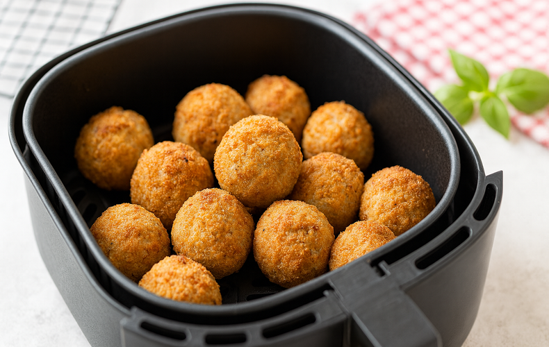 4. Adagiate le polpettine nel cestello della friggitrice ad aria e spruzzatele leggermente con l’olio di oliva, che darà loro un colore dorato e una croccantezza irresistibile.