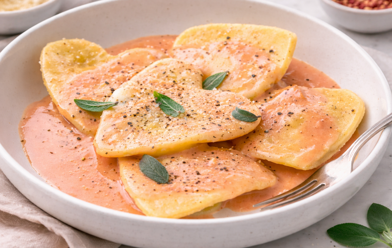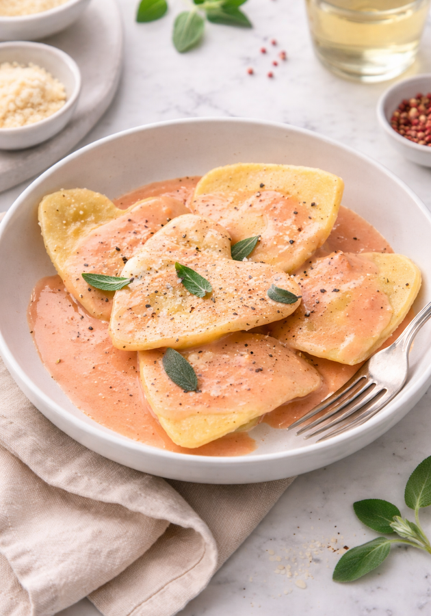 Il ripieno si può personalizzare in mille modi: provate con ricotta e spinaci, zucca e amaretti, oppure carne macinata e mortadella. Per un tocco ancora più elegante, potete colorare la pasta aggiungendo all’impasto un cucchiaino di polvere di barbabietola o di pomodoro per ottenere ravioli rosa o rossi. Come condimento, oltre alla salsa rosa, potete scegliere un semplice burro fuso con salvia e pepe rosa, oppure panna da cucina con una spolverata di parmigiano. Per un risultato ancora più raffinato, guarnite con scaglie di bottarga o gamberi interi saltati in padella.