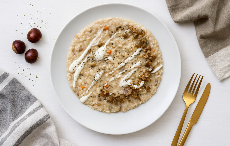 Piatti UniciRisotto alle CastagneScopri il risotto alle castagne, cremoso e avvolgente con robiola e timo fresco. Un piatto autunnale unico che unisce gusto delicato e originalità. Provalo ora!Ricetta di Andrea Bosetti • 27 Novembre 2025Club delle Ricette è anche su WhatsApp. Non perderti le ricette più nuove e ogni giorno i menu migliori e le idee per cucinare. Iscriviti al Canale Difficoltà MediaPreparazione 30 minutiCottura 1 oraDosi per 4 persone Guarda le VideoricetteSeguici su YouTube Anelli di Zucchine Seguici su YouTube! Anelli di Zucchine Invia × Facebook Twitter Email Pinterest Salva StampaRisotto alle Castagne Cremoso con Robiola e Timo, Perfetto per l’AutunnoSe siete alla ricerca di un piatto raffinato, perfetto per sorprendere ospiti e familiari nelle serate più fresche, la ricetta del risotto alle castagne è la scelta ideale. Questo risotto cremoso con castagne incarna tutto il meglio dell’autunno: profumi intensi e avvolgenti, una consistenza vellutata e un sapore che unisce la delicatezza delle castagne cotte al vapore alla morbidezza del riso Carnaroli. La robiola dona una cremosità irresistibile, mentre il timo fresco regala una nota aromatica unica. Se siete appassionati di primi piatti fuori dal comune e volete scoprire come preparare il risotto alle castagne con facilità, vi guideremo passo dopo passo in questa preparazione che saprà conquistare tutti al primo assaggio.Ideale per una cena speciale, per le festività, oppure quando sentite il desiderio di portare in tavola un risotto autunnale alle castagne dal gusto elegante e sorprendente. Il segreto? Scegliere castagne fresche e, per risparmiare tempo, sbucciarle quando sono ancora calde: il procedimento sarà molto più semplice e veloce. In pochi gesti, otterrete un risotto alle castagne facile e veloce, impreziosito da una leggera acidità della robiola che ben si sposa con le note dolci delle castagne e con il profumo fresco del timo.Ricco ma bilanciato, questo risotto con riso Carnaroli e castagne si abbina perfettamente al brodo vegetale che ne esalta le sfumature, offrendo una coccola perfetta anche per chi desidera portare in tavola un risotto alle castagne per cena o per le feste. Ogni boccone avvolge il palato, regalando una texture cremosa e un risotto alle castagne dal sapore delicato che riscalda anima e cuore.Se siete curiosi di provare altre creazioni a base di castagne o alla ricerca di ispirazione per i vostri menu, non perdete i Ravioli di Castagne, oppure assaporate l’abbinamento sorprendente del Risotto Gorgonzola e Pere, il profumo agrumato del Risotto all’Arancia o ancora il Risotto Radicchio e Gorgonzola e Cipolle Caramellate e il Risotto con Asparagi e Speck. Preparatevi a portare in tavola un risotto che conquisterà tutti!Ingredienti per 4 persone350 g di Riso Carnaroli400 g di Castagne250 g di Robiola200 g di Burro200 g di Grana Padanoq.b. di Caroteq.b. di Sedanoq.b. di Cipolle2 l di Brodo Vegetale1 bicchiere di Vino Biancoq.b. di Olio Extravergine d'Olivaq.b. di Saleq.b. di Pepeq.b. di TimoCopia Lista IngredientiApri in AppProcedimentoScarica la nostra APP Con meno pubblicità, puoi creare i tuoi ricettari e ricevere nuove ricette ogni giorno. Scarica APP Per preparare il risotto alle castagne, iniziate cuocendo al vapore le castagne per circa 40 minuti in una vaporiera in un cestello per cottura (collocato su una pentola con acqua che bolle). Una volta cotte eliminate ogni traccia di buccia o pellicina.Rosolate le castagne in una noce di burro presa dal totale insieme a un cucchiaio di foglioline di timo. Quando avranno preso colore, toglietele dal tegame e tenetele da parte.Nella stessa casseruola aggiungete un’altra noce di burro e fatevi soffriggere il trito di sedano, carota e cipolla. Unite anche il riso e tostatelo a fuoco medio. Sfumate con il vino bianco, facendo evaporare l’alcol. Continuate la cottura versando a poco a poco il brodo caldo, mescolando costantemente e regolando di sale.Nel frattempo preparate la crema di robiola: frullate la robiola con qualche cucchiaio di brodo, un filo di olio, foglioline di timo e pepe. Aggiungete brodo poco per volta fino a ottenere una crema liscia e cremosa.Alla fine della cottura del risotto, unite le castagne rosolate (tenendone da parte una piccola quantità per la decorazione) e mantecate con il restante burro e grana grattugiato. Il risotto dovrà risultare morbido e “all’onda”.Servite il risotto alle castagne nei singoli piatti, decorando con la crema di robiola, castagne sbriciolate, altro timo e una spolverata di pepe. Ricordate infine di scaricare la nostra App con contenuti esclusivi e meno pubblicità!Varianti e AlternativeProvate a sostituire la robiola con del taleggio per un gusto più intenso, oppure aggiungete dello speck croccante per un piacevole contrasto. Per un risotto alle castagne in versione vegana, utilizzate formaggio vegetale spalmabile e omettete il burro, sostituendolo con olio extravergine.ConsigliPreparate le castagne in anticipo e sbucciatele quando sono ancora tiepide, per facilitarvi il lavoro. Potete insaporire ulteriormente il piatto aggiungendo una grattugiata di scorza di limone o arricchirlo con funghi porcini per un gusto ancora più deciso.ConservazionePotete conservare il risotto alle castagne in frigorifero, chiuso in un contenitore ermetico, fino a 1 giorno. Il riscaldamento dovrà essere effettuato aggiungendo un po’ di brodo caldo per ripristinare la cremosità.Commenti ★ ★ ★ ★ ★ × 4 / 5 You need to enable JavaScript to vote Annulla risposta Lascia un commento
