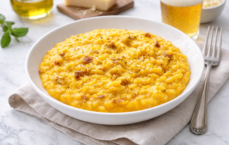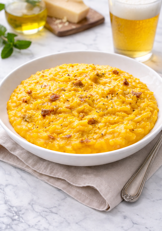 Scopri il gusto sorprendente del Risotto con Zucca e Salsiccia sfumato alla birra, una ricetta cremosa e veloce con zucca mantovana e un tocco aromatico unico