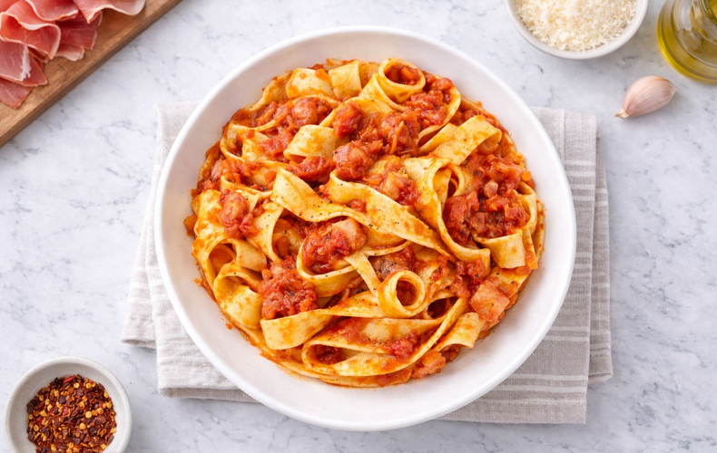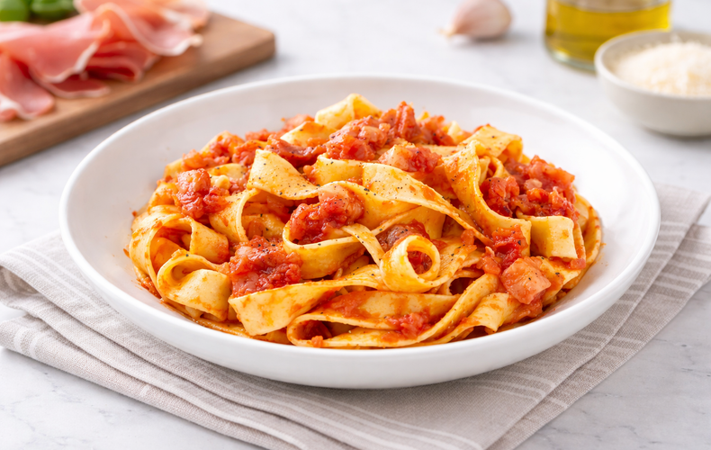 Primi PiattiTagliatelle al Prosciutto Crudo, Ricetta Tradizionale BologneseScopri le Tagliatelle al Prosciutto Crudo: pasta fresca fatta in casa, cipolle di Medicina e sugo saporito. Un piatto tradizionale bolognese dal gusto autentico e avvolgenteRicetta di Giorgio Loda • 5 Febbraio 2026Club delle Ricette è anche su WhatsApp. Non perderti le ricette più nuove e ogni giorno i menu migliori e le idee per cucinare. Iscriviti al Canale Difficoltà MediaPreparazione 30 minutiCottura 30 minutiDosi per 4 persone Guarda le VideoricetteSeguici su YouTube Anelli di Zucchine Seguici su YouTube! Anelli di Zucchine Invia × Facebook Twitter Email Pinterest Salva StampaTagliatelle al Prosciutto Crudo Cremose e Veloci, Ricetta Bolognese AutenticaSe siete alla ricerca di un primo piatto che sappia esaltare la convivialità di un pranzo in famiglia, la ricetta delle tagliatelle al prosciutto crudo è ciò che fa per voi. Immaginate di portare in tavola un piatto ricco, profumato e colorato, dove la delicatezza della pasta fresca abbraccia la bontà di un sugo avvolgente, realizzato con ingredienti semplici e genuini. La preparazione delle tagliatelle al prosciutto crudo è un vero e proprio rito fatto di attenzione ai dettagli e amore per la tradizione, perfetta per chi desidera cimentarsi nell’autentica arte della sfoglia all’uovo, seguendo il classico rapporto di un uovo ogni 100 grammi di farina.Uno degli aspetti più affascinanti di questa tagliatelle al prosciutto crudo fatta in casa è il condimento, che accosta la sapidità del crudo alla dolcezza delle cipolle—meglio ancora se si usano le celebri cipolle di Medicina—insieme a una passata di pomodoro che regala un tocco di colore e morbidezza. Se desiderate una nota ancora più cremosa, provate la variante tagliatelle con prosciutto crudo e panna, amata da adulti e bambini per il suo gusto vellutato. La cottura delle tagliatelle al prosciutto crudo richiede solo pochi minuti, così da mantenere la pasta perfettamente al dente e il condimento ben amalgamato.Questa tagliatelle semplice con prosciutto crudo conquisterà anche gli ospiti più esigenti, regalando un’esperienza genuina e irresistibile a ogni forchettata. Se vi incuriosisce sperimentare nuove varianti, lasciatevi tentare anche dalle Tagliatelle alla Crema di Parmigiano e Pancetta Croccante, dalle Tagliatelle Radicchio e Speck o dalle Tagliatelle ai Funghi. Ideale nei menu delle feste come nella routine quotidiana, un piatto di tagliatelle per pranzi in famiglia sa sempre mettere d’accordo tutti. E per chi ama le consistenze soffici, non dimenticate la versione tagliatelle cremose al prosciutto crudo o la raffinata Tagliatelle Cremose alla Zucca e Salvia. Con pochi passaggi, ingredienti freschi e qualche accorgimento, scoprirete come fare le tagliatelle al prosciutto crudo indimenticabili!Ingredienti per 4 personePer la pasta fresca:400 g di Farina 004 di Uova1-2 cucchiai di Acqua se necessarioPer il condimento:2 Cipolle200 g di Prosciutto Crudo1/2 bicchiere di Latte caldo1/2 bicchiere di Passata di pomodoro caldaq.b. di Burroq.b. di Pepeq.b. di Sale per l'acqua di cotturaCopia Lista IngredientiApri in AppProcedimentoScarica la nostra APP Con meno pubblicità, puoi creare i tuoi ricettari e ricevere nuove ricette ogni giorno. Scarica APP Per preparare le tagliatelle al prosciutto crudo iniziate dalla pasta fresca all’uovo. In una ciotola capiente versate la farina 00 e create una fontana al centro, quindi rompetevi le uova. Tenete da parte l’acqua che vi servirà solo se l’impasto dovesse risultare troppo asciutto. Cominciate a mescolare con una forchetta partendo dal centro, incorporando gradualmente la farina dal bordo interno della fontana. Quando il composto diventa troppo denso per la forchetta, trasferitelo su una spianatoia leggermente infarinata e iniziate a impastare energicamente con le mani.Lavorate l’impasto con decisione per circa 10 minuti, premendo con il palmo della mano, ripiegando su sé stesso e ruotandolo, fino ad ottenere un panetto liscio, morbido ed elastico. Se notate che l’impasto è troppo duro e fatica a compattarsi, unite 1-2 cucchiai di acqua poco alla volta. Una volta raggiunta la giusta consistenza, avvolgete il panetto nella pellicola trasparente e lasciatelo riposare a temperatura ambiente per 30 minuti. Questo passaggio è fondamentale per rilassare il glutine e facilitare la stesura della sfoglia.Trascorso il tempo di riposo, dividete l’impasto in 4-5 porzioni più gestibili. Prendete una porzione per volta e appiattitela leggermente con un mattarello, mantenendo le altre coperte con la pellicola per evitare che si secchino. Se utilizzate la macchina per la pasta fresca, fissatela al tavolo con il morsetto e posizionate la ghiera sul numero 0 per la massima apertura dei rulli. Fate passare la pasta attraverso i rulli lisci, cospargendo con un po’ di farina se necessario per evitare che si attacchi.Procedete passando la sfoglia attraverso i rulli, stringendo gradualmente da 0 fino al numero 5, per ottenere lo spessore ideale per le tagliatelle. Una volta raggiunto lo spessore desiderato, tagliate la sfoglia a metà per facilitarne la lavorazione. Infarinate leggermente e fate passare le sfoglie attraverso l’accessorio per le lasagnette o tagliatelle della macchina, oppure arrotolate la sfoglia su sé stessa e tagliatela a mano con un coltello affilato a strisce larghe circa 5-6 millimetri.Disponete le tagliatelle ottenute su una spianatoia ben infarinata, sistemandole affiancate senza sovrapporle per evitare che si attacchino tra loro. Lasciatele asciugare leggermente mentre vi dedicate alla preparazione del condimento. Nel frattempo, tritate finemente le cipolle di Medicina e tagliate il prosciutto crudo a cubetti di circa mezzo centimetro, utilizzando sia la parte magra che quella grassa per un condimento più saporito.In una capiente padella antiaderente fate sciogliere una noce di burro a fiamma bassa. Aggiungete le ci