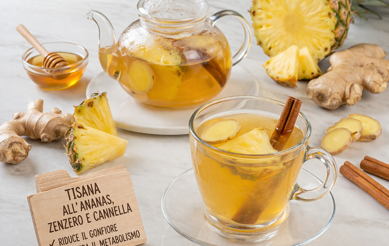 BevandeTisana all’Ananas, Zenzero e Cannella SgonfianteScopri la ricetta della tisana all'ananas, zenzero e cannella: una bevanda naturale sgonfiante, digestiva e bruciagrassi che riduce il gonfiore addominale e accelera il metabolismo.Ricetta di Andrea Bosetti • 8 Aprile 2026Difficoltà MediaPreparazione 5 minutiCottura 10 minutiDosi per 2 tazze Invia × Facebook Twitter Email Pinterest Salva StampaLa tisana all’ananas, zenzero e cannella è una di quelle bevande che preparo volentieri quando ho voglia di qualcosa di caldo, profumato e piacevole da sorseggiare nei momenti di pausa. Mi piace perché unisce sapori intensi e aromatici in una combinazione semplice ma molto gradevole, perfetta dopo i pasti oppure al mattino, quando si cerca una coccola leggera da inserire nella routine quotidiana. È una preparazione facile da fare in casa e proprio per questo trovo che abbia un fascino particolare: pochi ingredienti, nessun passaggio complicato e un profumo che sa subito di benessere.Quello che adoro di questa tisana con ananas, zenzero e cannella è l’equilibrio tra la nota fresca e fruttata dell’ananas, il carattere vivace dello zenzero e l’aroma caldo della cannella. Insieme creano una bevanda dal gusto avvolgente, spesso scelta da chi ama le tisane digestive e sgonfianti e vuole concedersi una pausa naturale e aromatica durante la giornata. È una ricetta semplice, economica e versatile, perfetta per chi cerca una tisana fatta in casa dal sapore intenso e piacevole, da gustare con calma come piccolo rituale di benessere quotidiano.Ingredienti per 2 tazze500 ml di Acqua2 fette di Ananas fresco3 fettine di Zenzero1 stecca di Cannella oppure ½ cucchiaino in polvere1 cucchiaino di Miele facoltativo, per dolcificareCopia Lista IngredientiApri in AppProcedimentoPer preparare la Tisana all’Ananas, Zenzero e Cannella Sgonfiante, iniziate portando l’acqua a ebollizione in un pentolino.Nel frattempo, pelate lo zenzero fresco e tagliatelo a fettine sottili. Tagliate anche l’ananas a cubetti o a fette, eliminando la buccia.Quando l’acqua bolle, aggiungete i pezzetti di ananas, le fettine di zenzero e la stecca di cannella (o la cannella in polvere).Abbassate il fuoco e lasciate sobbollire a fuoco basso per circa 10 minuti, in modo che gli ingredienti rilascino tutti i loro principi attivi nell’acqua.Spegnete il fuoco e lasciate riposare la tisana per 5 minuti con il coperchio, così da completare l’infusione.Filtrate la tisana con un colino a maglie fini versandola direttamente nelle tazze. Se lo desiderate, aggiungete un cucchiaino di miele per dolcificare. Bevete calda o tiepida. Ricordate infine di scaricare la nostra App con contenuti esclusivi e meno pubblicità!Varianti e AlternativePotete arricchire la tisana con qualche foglia di menta fresca per una nota rinfrescante, oppure aggiungere una fettina di limone o lime per aumentare l’effetto drenante grazie alla vitamina C. Per una versione più intensa, aggiungete un pizzico di pepe di Cayenna che amplifica l’effetto termogenico. In estate, lasciate raffreddare completamente la tisana, aggiungete ghiaccio e servitela come drink detox freddo.ConsigliPer ottenere il massimo beneficio sgonfiante e digestivo, bevete la tisana al mattino a digiuno oppure 30 minuti dopo i pasti principali. Usate sempre ananas fresco e zenzero fresco, poiché contengono una concentrazione maggiore di enzimi e principi attivi rispetto alle versioni secche o in succo. Se soffrite di reflusso gastroesofageo, riducete la quantità di zenzero.ConservazioneLa tisana si può conservare in frigorifero in un contenitore ermetico o una bottiglia di vetro per un massimo di 24 ore. Prima di berla, riscaldatela leggermente oppure consumatela fredda come bevanda dissetante estiva.Commenti ★ ★ ★ ★ ★ × 4 / 5 You need to enable JavaScript to vote Annulla risposta Lascia un commento