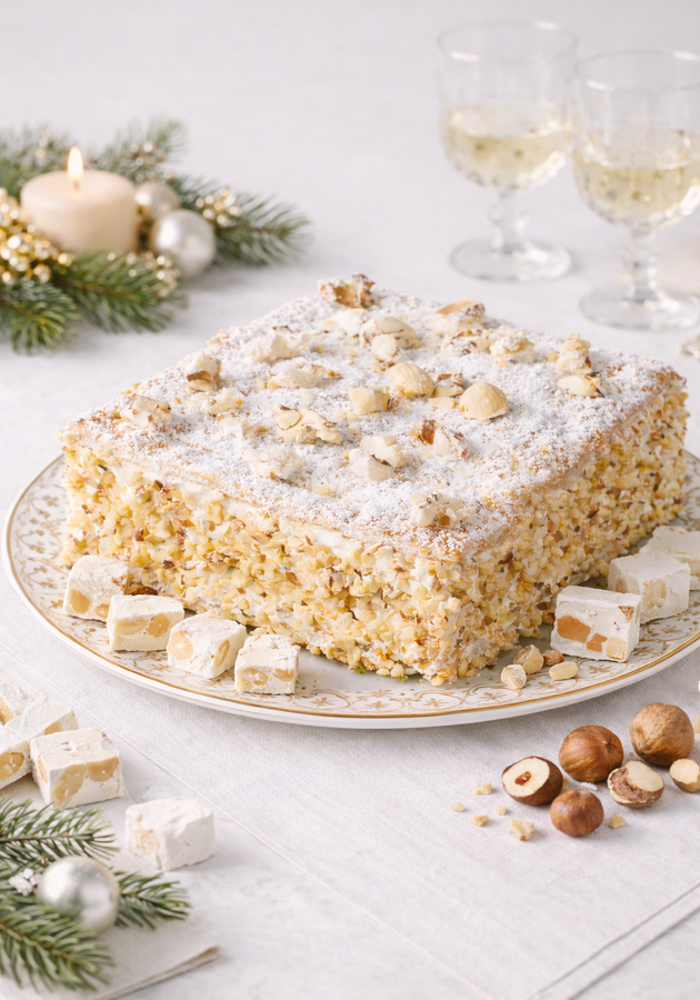 Scopri la Torta Millefoglie con crema al torrone, un dessert raffinato e veloce con sfoglia croccante, cremosa al mascarpone e pezzi di torrone bianco croccante