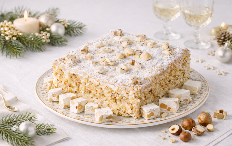 8. Conservate la torta in frigorifero per farla assestare; ricordatevi di estrarla circa 20 minuti prima di servirla. Appena prima di portarla in tavola, spolverizzate la superficie con abbondante zucchero a velo e decorate con i pezzetti di torrone tenuti da parte. Ricordate infine di scaricare la nostra App con contenuti esclusivi e meno pubblicità!