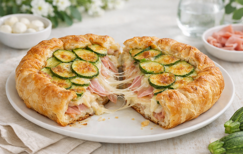 Secondi PiattiTorta Salata Zucchine e ProsciuttoScoprite la ricetta della Torta Salata Zucchine Crude e Prosciutto: una torta rustica con pasta sfoglia, provola filante, prosciutto cotto e zucchine fresche a fette. Pronta in 30 minuti, croccante e saporita!Ricetta di Andrea Bosetti • 31 Marzo 2026Difficoltà MediaPreparazione 5 minutiCottura 25 minutiDosi per 8 persone Invia × Facebook Twitter Email Pinterest Salva StampaLa torta salata zucchine crude e prosciutto è una di quelle ricette che preparo volentieri quando ho poco tempo ma voglio comunque portare in tavola qualcosa di buono, semplice e curato. Mi piace perché con pochi ingredienti si ottiene una preparazione rustica ma molto invitante, perfetta per una cena veloce, un antipasto da condividere o un pranzo fuori casa. È una di quelle torte salate con zucchine che riescono a fare bella figura senza richiedere passaggi complicati.Quello che adoro di questa ricetta è la sua praticità: le zucchine crude vengono affettate sottili e sistemate direttamente sulla base, senza bisogno di precottura, rendendo tutto ancora più rapido e semplice. Insieme al prosciutto cotto, alla provola filante e alla pasta sfoglia croccante, creano un equilibrio di sapori delicato ma molto gustoso. Il risultato è una torta salata con zucchine e prosciutto perfetta da servire sia calda che a temperatura ambiente, ideale soprattutto in primavera e in estate, quando si cercano piatti facili, versatili e pieni di sapore.Ingredienti per 8 persone1 rotolo di Pasta Sfoglia rotonda2 Zucchine piccole3 fette di Prosciutto Cotto o speck50 g di Provola2 cucchiai di Parmigiano Reggiano1 Uovoq.b. di Saleq.b. di Olio Extravergine d'OlivaCopia Lista IngredientiApri in AppProcedimentoPer preparare la Torta Salata Zucchine Crude e Prosciutto, iniziate srotolando la pasta sfoglia e adagiatela, con tutta la sua carta forno, all’interno di una pirofila bassa e larga di almeno 28 cm di diametro. Sistematela per bene, facendo aderire bene i bordi.Distribuite sulla base della pasta sfoglia le fette di provola dolce (o scamorza), coprendo tutta la superficie. Sovrapponete poi le fette di prosciutto cotto (o speck) in modo uniforme.Con l’aiuto di una mandolina, affettate le zucchine crude a fette molto sottili. Disponetele a raggiera sopra il prosciutto, partendo dal bordo verso il centro, fino a coprire tutto il ripieno.Condite lo strato di zucchine con sale, un filo di olio extravergine d’oliva e i due cucchiai di parmigiano grattugiato. Se lo desiderate, spennellate la superficie con l’uovo sbattuto per una doratura più intensa.Trasferite la torta salata in forno già caldo, modalità ventilata, a 190°C e cuocetela per circa 20-25 minuti, fino a quando la pasta sfoglia risulterà dorata e croccante.Sfornate la torta salata e fatela raffreddare qualche minuto su una gratella: questo trucchetto permetterà all’aria di circolare sotto la base, mantenendo la pasta sfoglia croccante e non molle. Servitela calda o fredda a piacere. Ricordate infine di scaricare la nostra App con contenuti esclusivi e meno pubblicità!Varianti e AlternativePer una versione vegetariana, omettete il prosciutto e aggiungete qualche pomodorino secco o olive taggiasche per un tocco di sapore in più. Potete sostituire la provola con mozzarella fiordilatte ben scolata o con formaggio di capra. Per una variante più ricca, aggiungete qualche cucchiaio di ricotta mescolata con erbe aromatiche fresche come basilico o menta prima di stendere le zucchine.ConsigliIl segreto per una pasta sfoglia davvero croccante è farla raffreddare su una gratella non appena uscita dal forno, evitando che il vapore si accumuli sotto la base. Usate una mandolina per ottenere fette di zucchine uniformi e sottilissime: cuoceranno alla perfezione senza risultare dure. Se volete un sapore più intenso, sostituite il prosciutto cotto con lo speck affumicato.ConservazioneLa Torta Salata Zucchine Crude e Prosciutto si conserva in frigorifero, coperta con pellicola trasparente o in un contenitore ermetico, per un massimo di 2 giorni. Prima di servirla, potete riscaldarla qualche minuto in forno o in friggitrice ad aria per ritrovare la croccantezza della pasta sfoglia. Non è consigliabile congelarla.Commenti ★ ★ ★ ★ ★ × 4 / 5 You need to enable JavaScript to vote Annulla risposta Lascia un commento